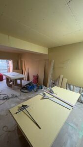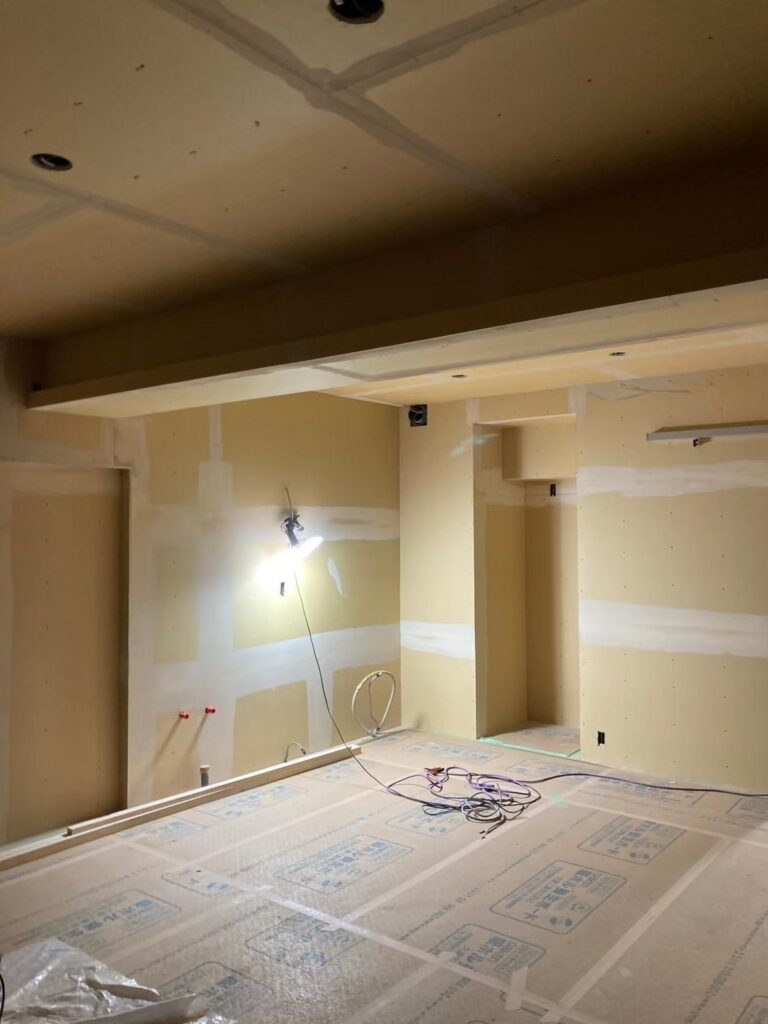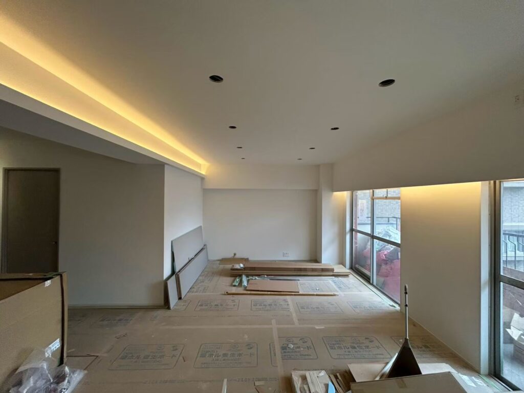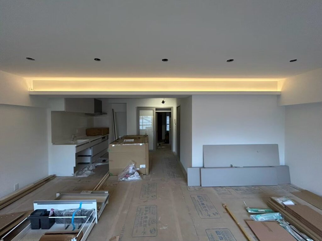 そしてキッチンを設置したり、建具を設置したりします。照明器具も取り付けが始まり通電すると雰囲気が一変します!毎回思うのですが、このタイミングが大好きです。