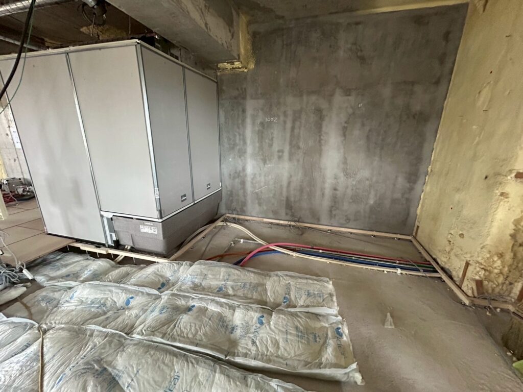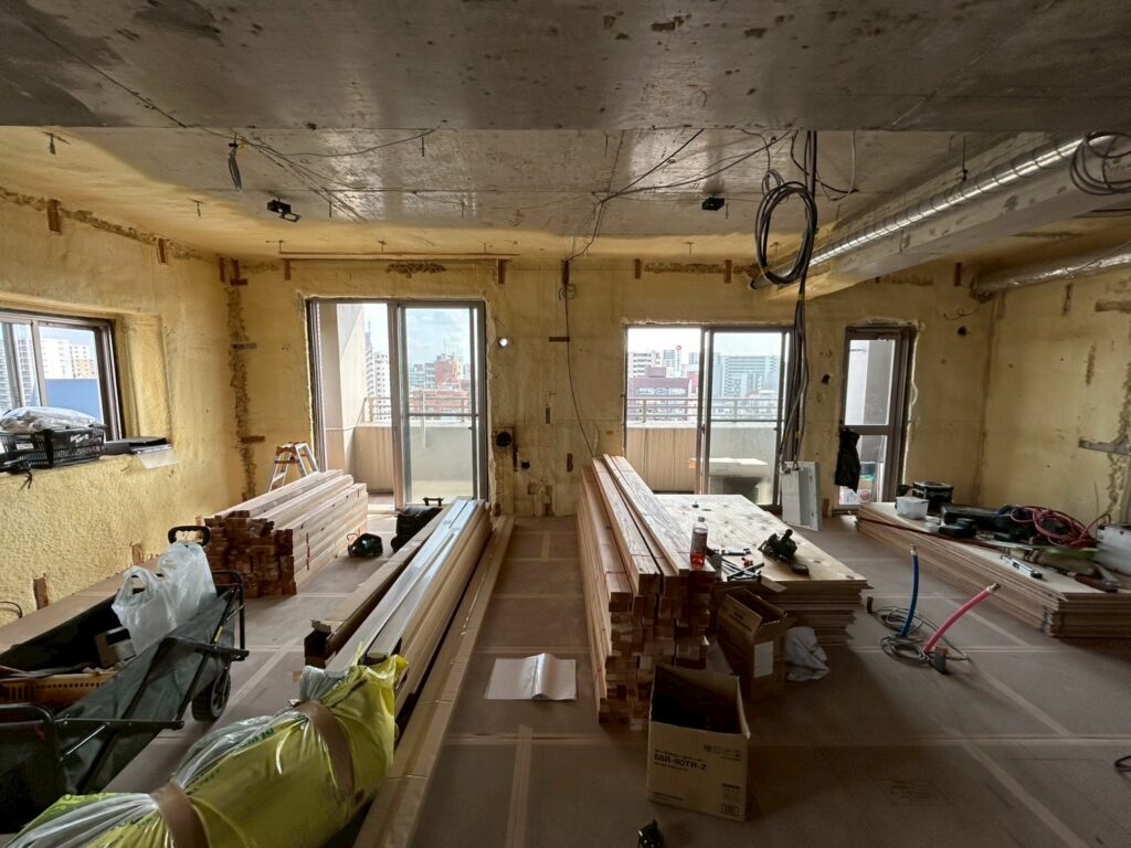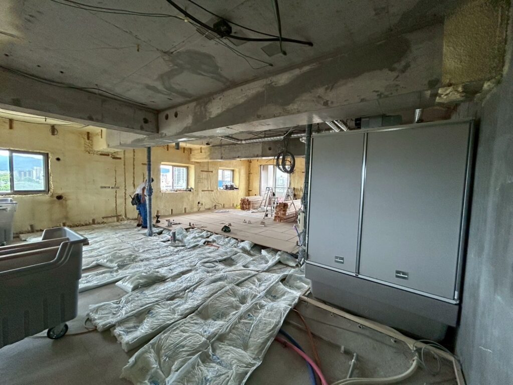 現地は床の下地となる乾式2重床工法と呼ばれるものを先行して行いました。これは主な目的としては下の階への防音性能を高められること、そして床下に空間を設けることで配管を転がして設置できるというメリットがあるものです。今回のリノベーションではさらに防音性を高めること、そして床暖房を設けるので断熱性能を高めるという理由から、パーチクルボードと呼ばれる下地板の下に断熱材をぎっちり敷き並べました。