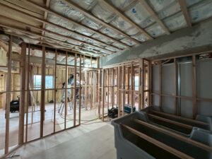 あとリノベーション工事ではお風呂は早ければ早い設置が好ましいので可能な限り墨出し作業のあとにすぐに設置するような工程をくみます。写真にある四角の箱がユニットバスなのです。床下地工事が終われば、壁や天井の下地となる木材で骨組みを作り始めます。