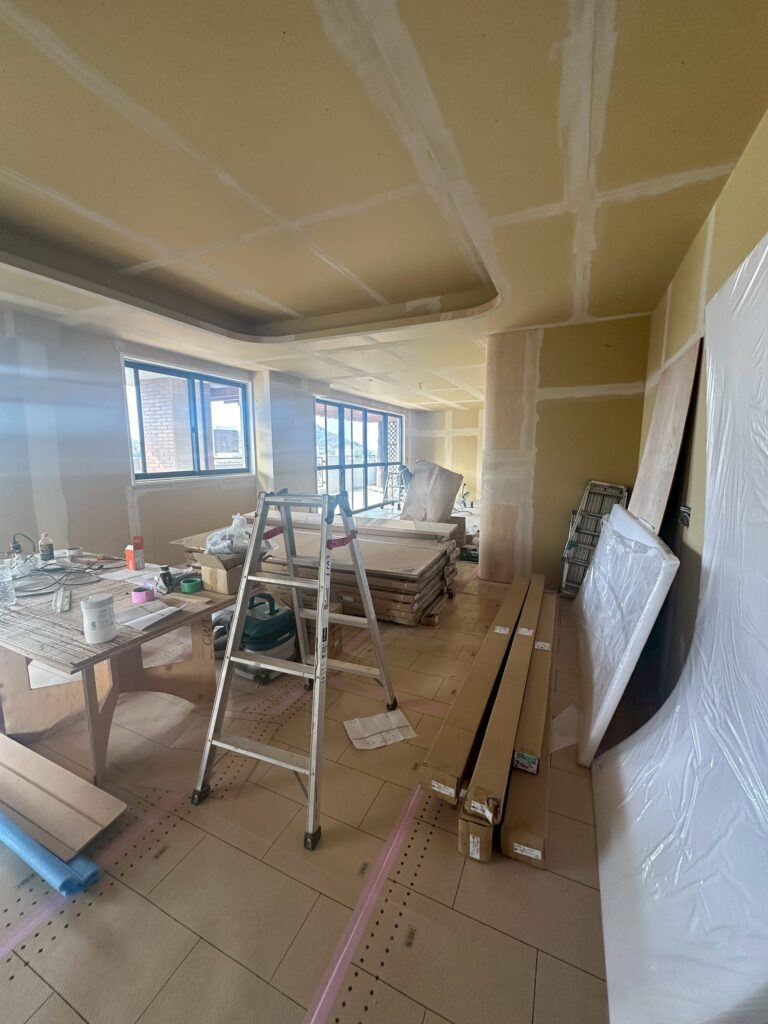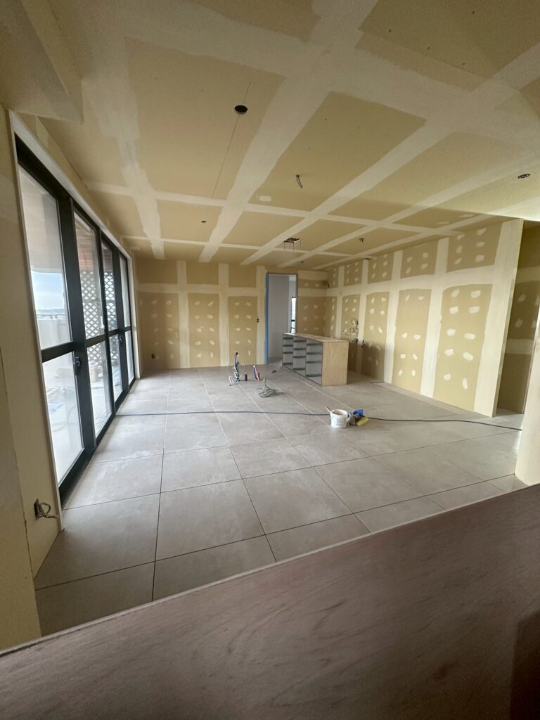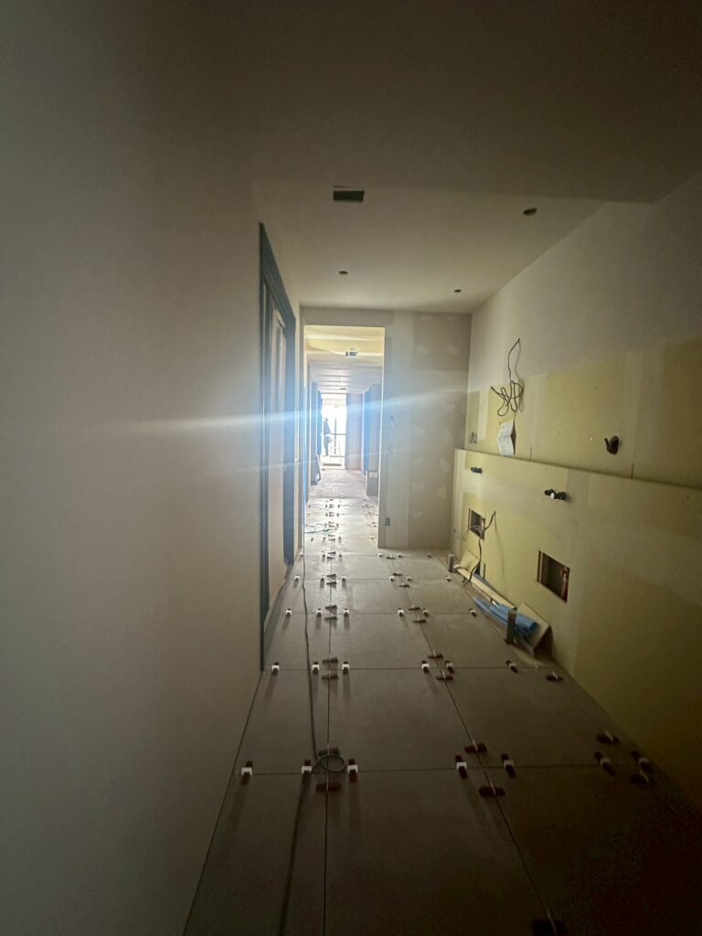 内装の仕上中 2026 2/24 現在、こちらのプロジェクトは内装工事の真っ最中です。床にタイルを貼ったり、壁や天井に壁紙を貼ったり、塗装したりと日々、変化が続く状態です。ここまで来ると後は完成まで一気に駆け抜けられます。 内装が仕上がると、造作家具や照明や水回り関連の器具を設置して終了です。いよいよ完成に向けてラストスパート。 下関MR タイル工事 内装仕上 内装工事 購入前の物件チェックを 解体が進む RELATED POSTS 工事に入る前の共用部養生 再生するということ 造作工事から内装仕上にシフト