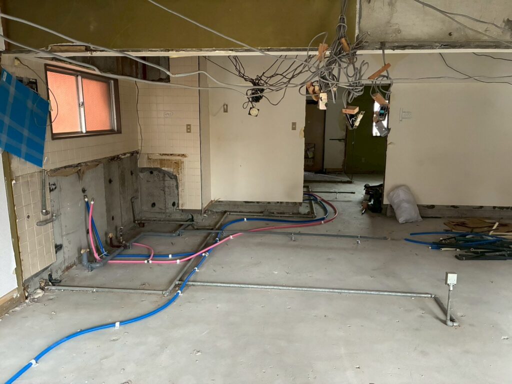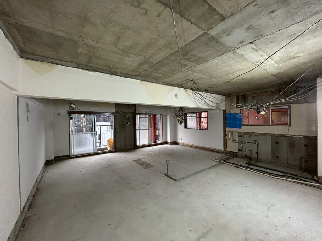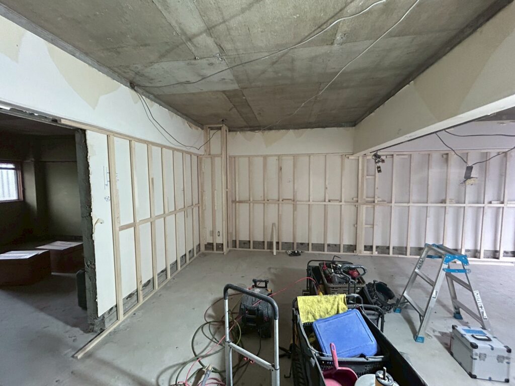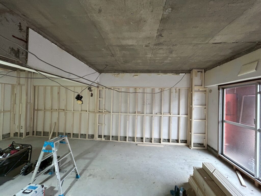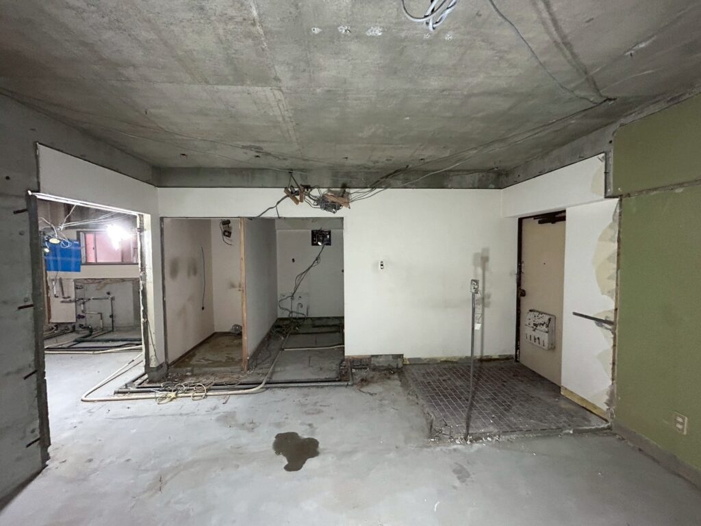 こちらの案件は、内部の解体がすべて終わり、大工さんたちの工事が始まりました。解体後の状況はこちら。このマンションのリノベーション工事は難易度が高く、設計中に頭を抱えることが多かったです。