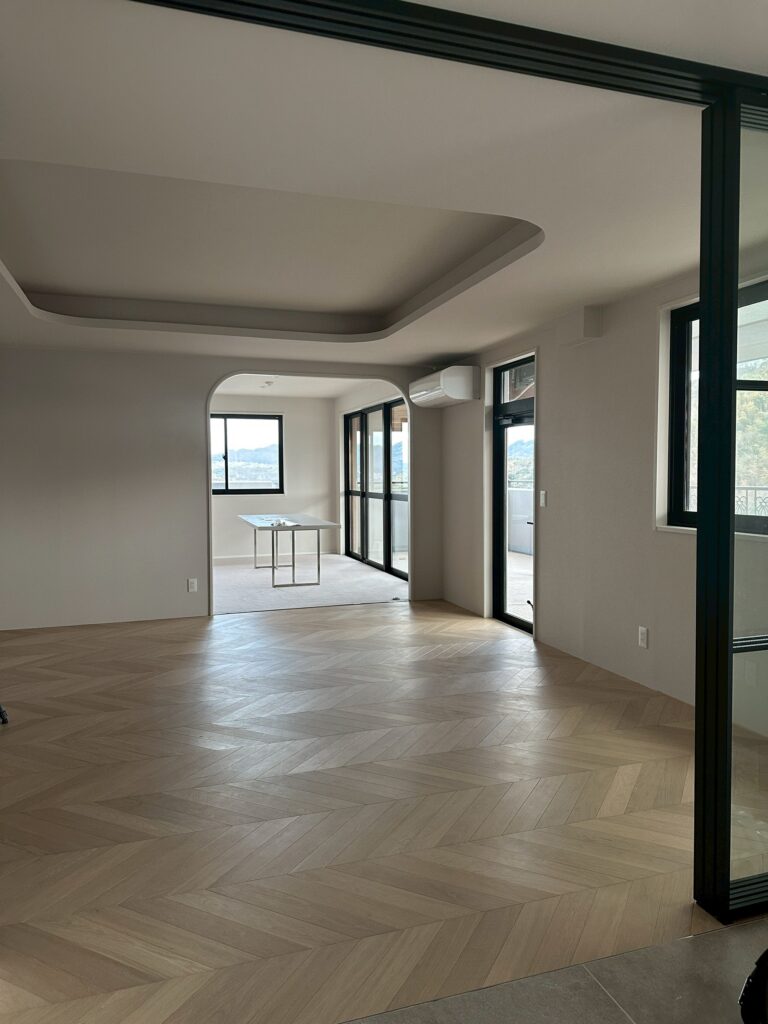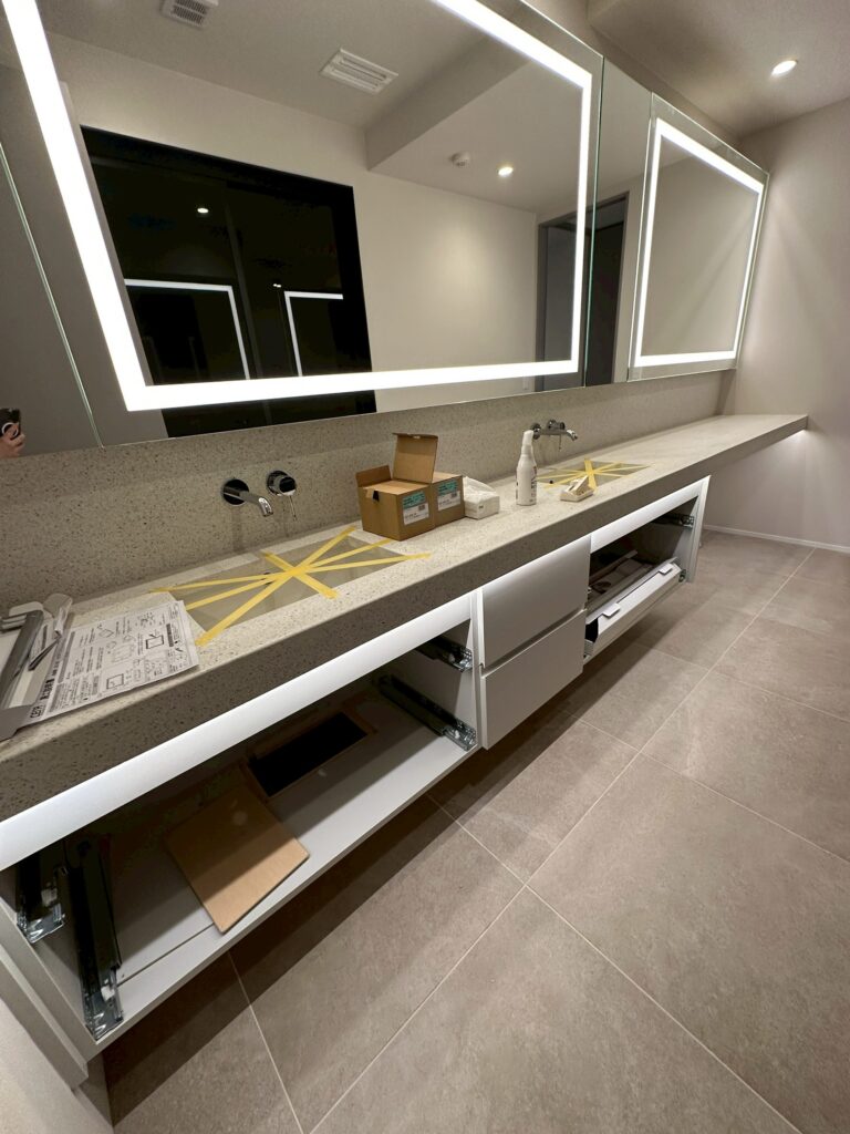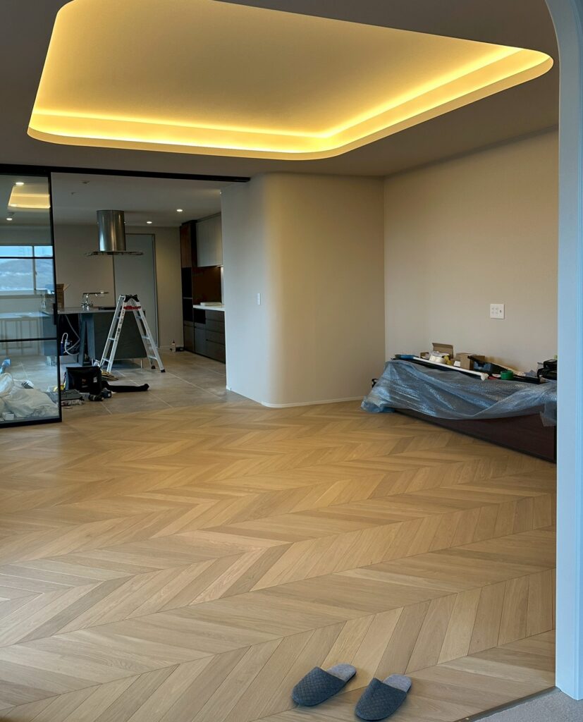 現在は、照明や水回りなどの器具付け、養生の撤去、そして竣工クリーニングの準備を進めているところです。現場特有の慌ただしさが落ち着き、空間は工事中とはガラリと違う、上質な空気感へと変わりつつあります。