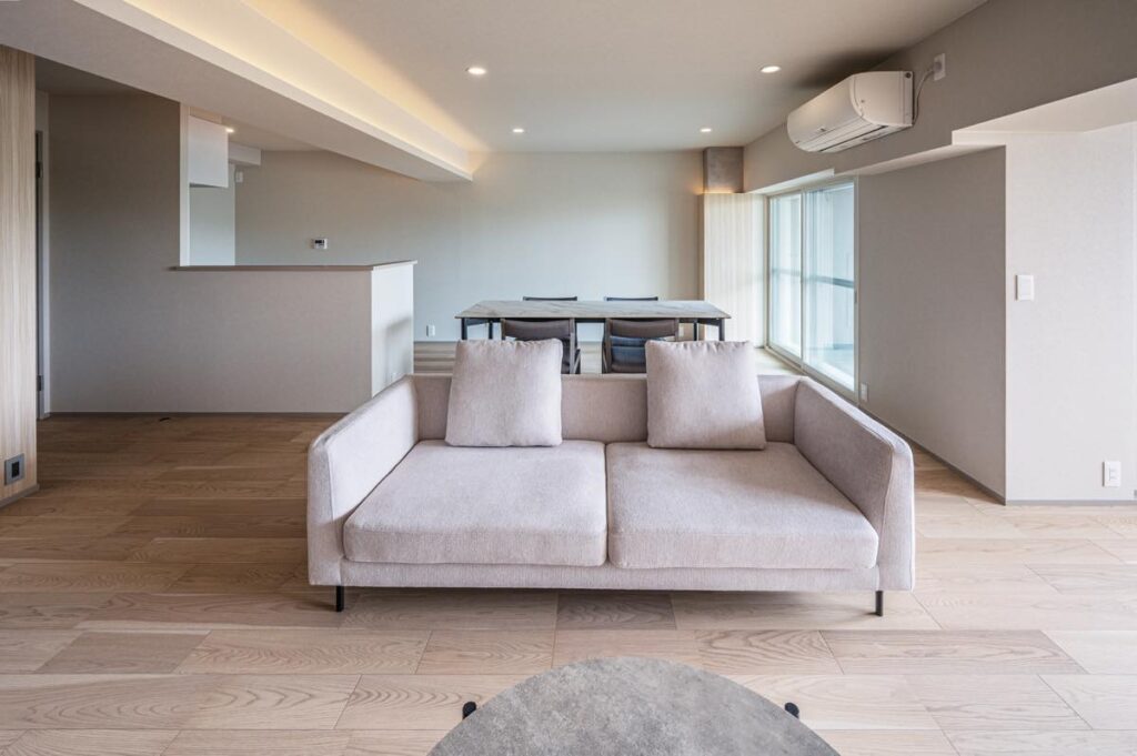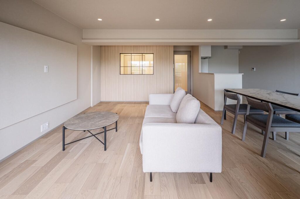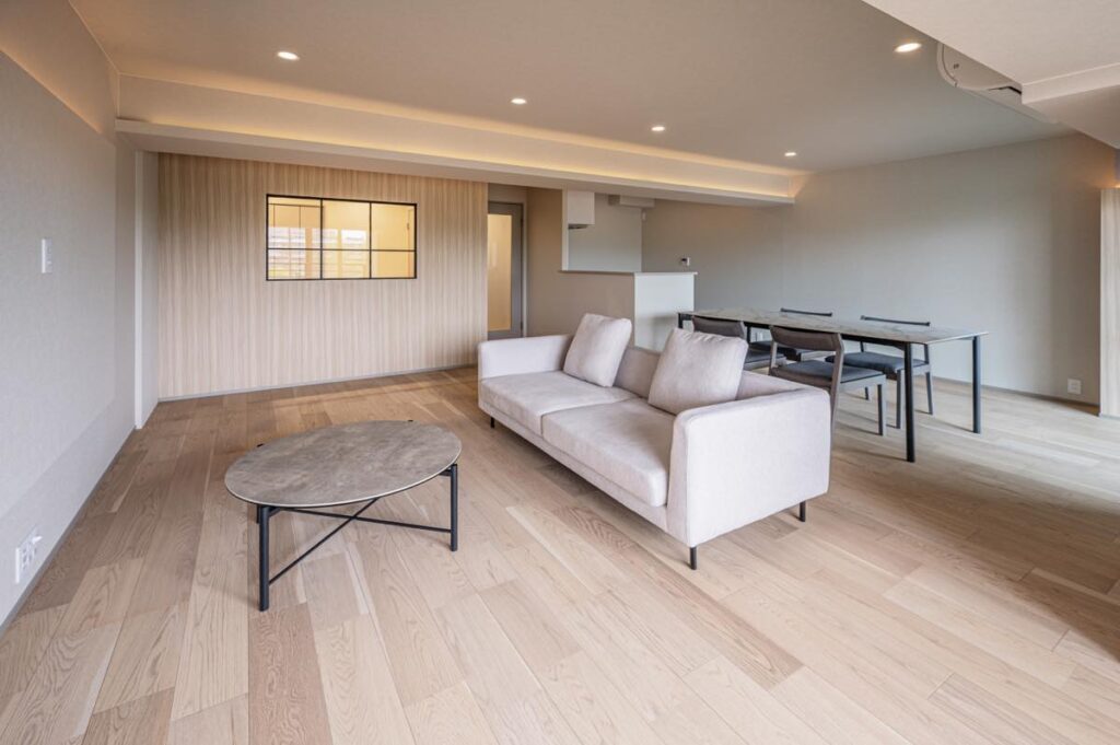 縦に長い間取りの特性を逆手に取り、リビングダイニングは遮るもののない、広く開放的な構成へ。南側の大きな開口部から差し込む自然光が、部屋の奥まで心地よく届きます。